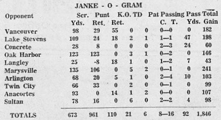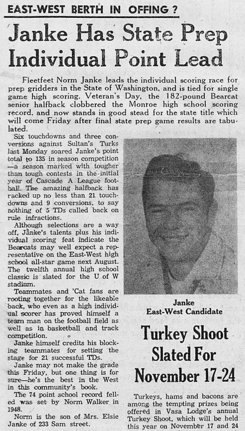 The 1956 season was one of the best of the decade and Norm Janke was one of the key contributors on a solid squad of players. In the opening game of the season, Janke immediately proved his sophomore year was no fluke as he ran for 138 yards before leaving with an injury. Though the team stumbled against Bothell High School in the opener, the Bearcats ran over their conference opponents as Janke paved the way. After the fifth game of the season, Janke accounted for over 450 yards of total offense as the team met undefeated Oak Harbor for an important league showdown. The game ended in a scoreless tie as Janke was held to 52 yards, forcing Monroe to win out the rest of the season for a chance at the conference title. With the season on the line, Janke carried the team the remainder of the year.