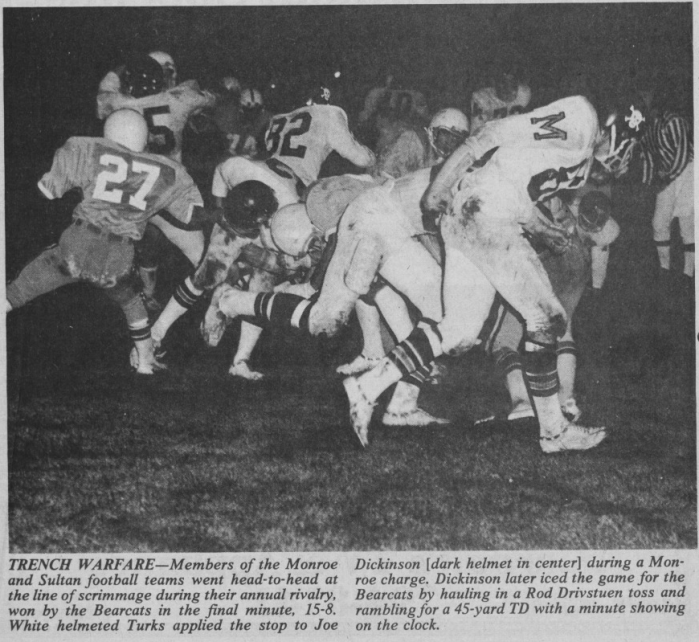 The game was a close-fought battle as the Bearcats held a narrow 7-0 lead thanks to a Drivstuen touchdown pass. In the third quarter, Sultan scored a touchdown and converted on a two-point attempt to go ahead 8-7. Monroe failed to muster any offense until the final minute of play. With little more than a minute left, Drivstuen delivered a pass to his favorite target, Joe Dickinson, who raced 40 yards to the endzone. After securing a two-point conversion on a QB sneak by Drivstuen, Monroe held on and secured a 15-8 victory over Sultan.[9]