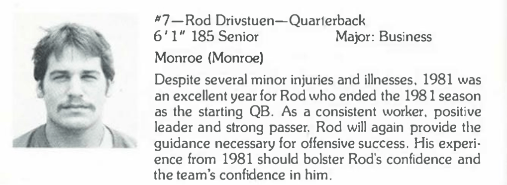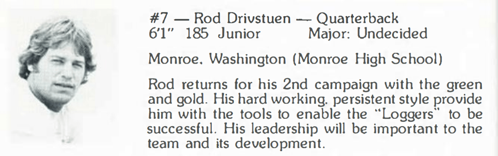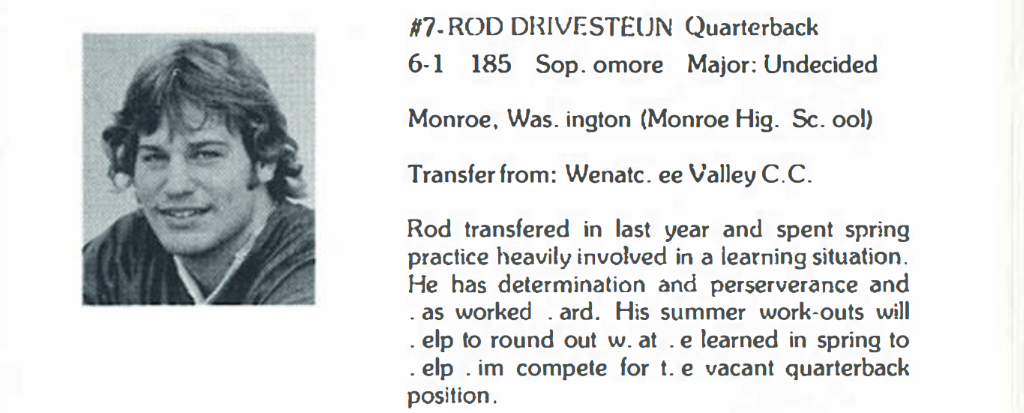 After graduating from Monroe High School in 1978, Drivstuen spent one year at Wenatchee Community College before transferring to a larger institution. He landed at the University of Puget Sound in Tacoma, Washington in 1980 and found a spot on the Loggers football team.[11] Rod played sparingly during his first season as a sophomore but became the Logger’s primary quarterback the following year.[12]