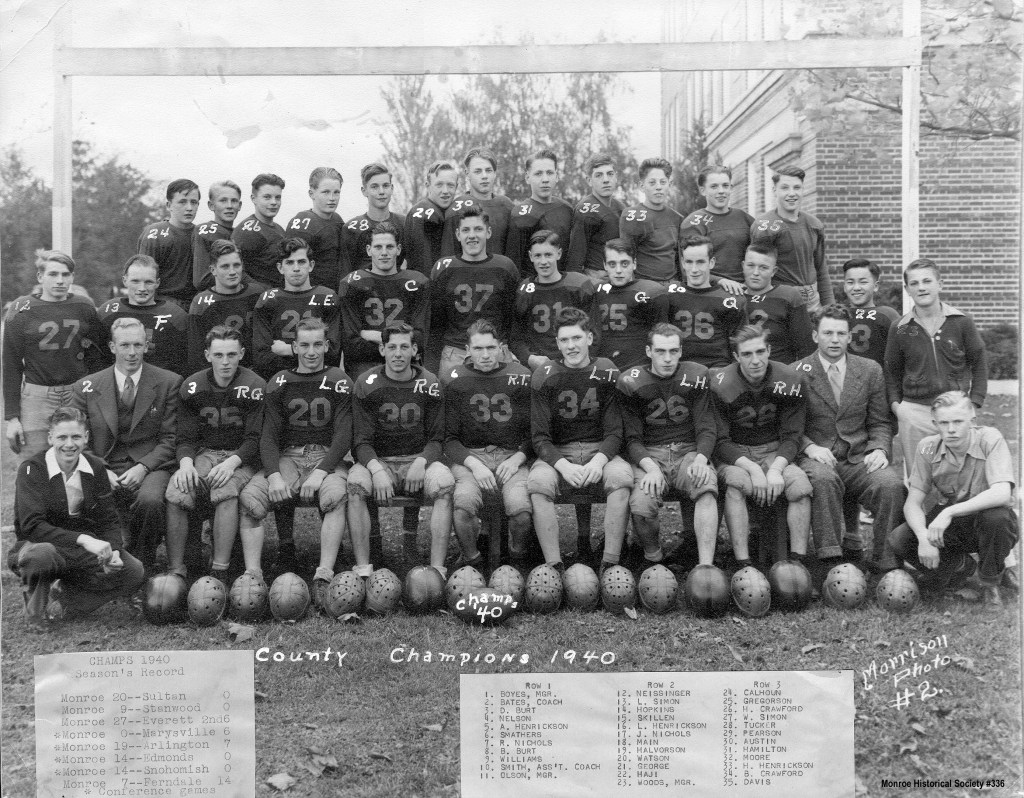 1940 Bearcats in Formation1940 Monroe Bearcats Team1945 Monroe Bearcats Team1946 Monroe Bearcats Team1946 Bearcats in Formation1947 Monroe Bearcats Team1947 Bearcats Strike a Pose1948 Monroe Bearcats Team1949 Monroe Bearcats TeamTicket Stub for Monroe-Sultan game, 1941Lyrics for “On Monroe”, 1945