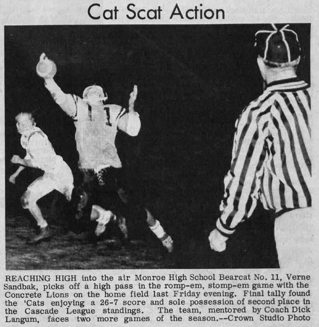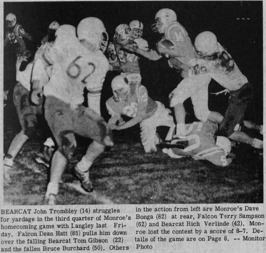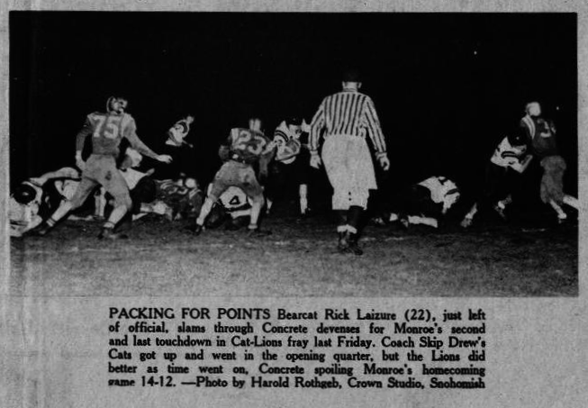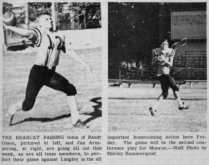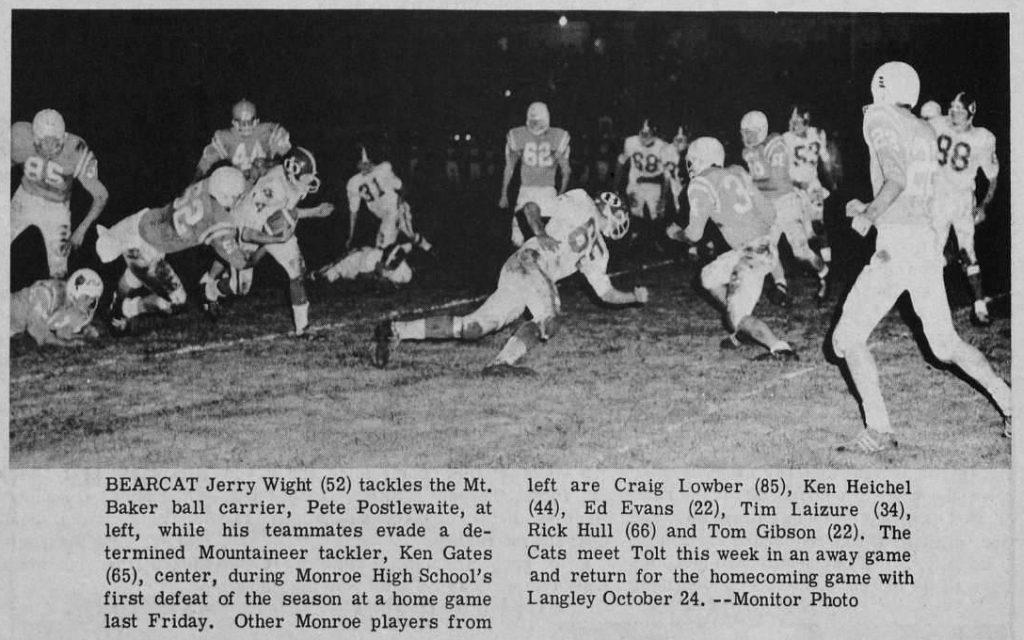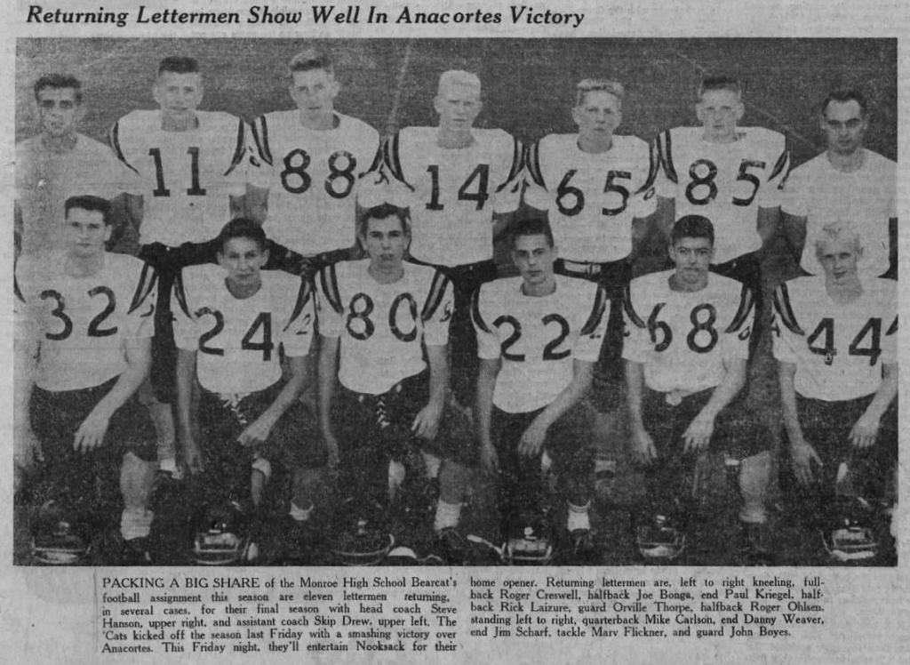 Monroe vs Lake Stevens, 19601962 Monroe Bearcats TeamMonroe at Sultan, 19621963 Monroe Bearcats LettermenRoger Creswell, Roger Ohlsen, and Coach Hansen, 1963Coach Hanson, Jimmy Scharf, Danny Weaver, and Rick Laizure, 1963Monroe vs Concrete, 19641965 Monroe Bearcats TeamMonroe vs Langley, 1965Monroe vs Stanwood, 19651966 Monroe Bearcats TeamMonroe vs Lynden, 1966Monroe vs King’s Garden, 1966Monroe vs Lake Stevens, 1966Monroe vs Concrete, 1966Monroe Offensive Linemen, 1967Randy Olson and Jim Armstrong, 19671969 Monroe Bearcats TeamMonroe vs Mount Baker, 1969Monroe vs Langley, 1969