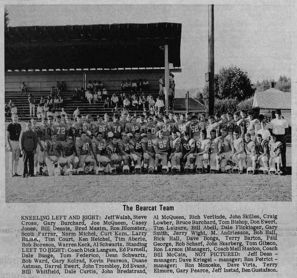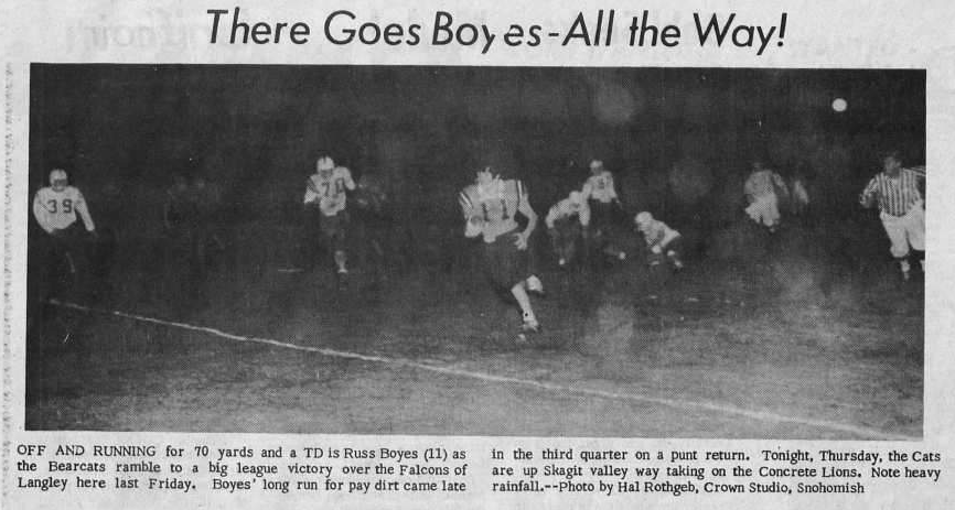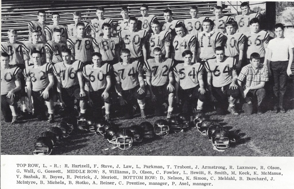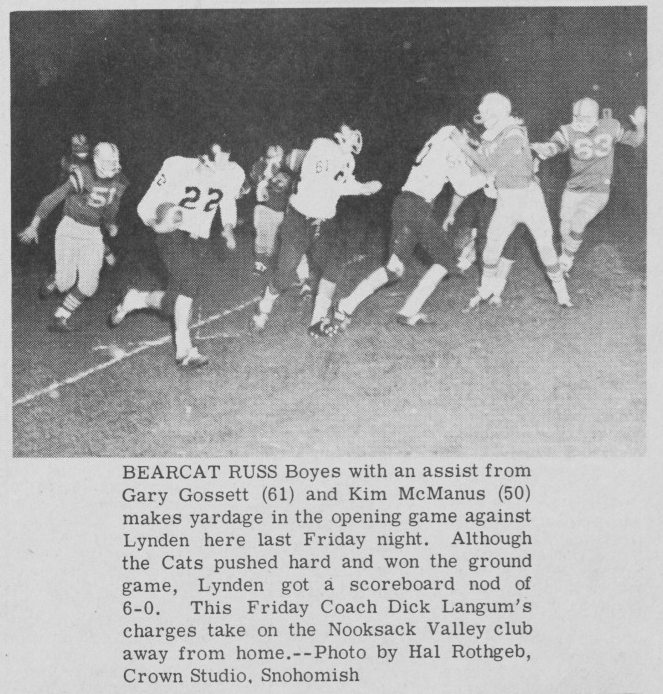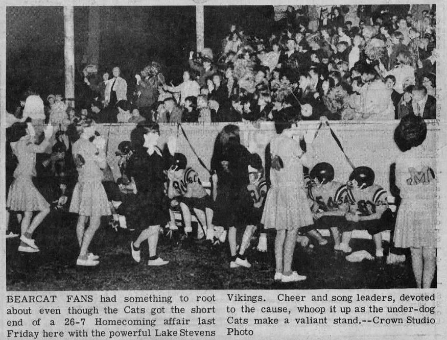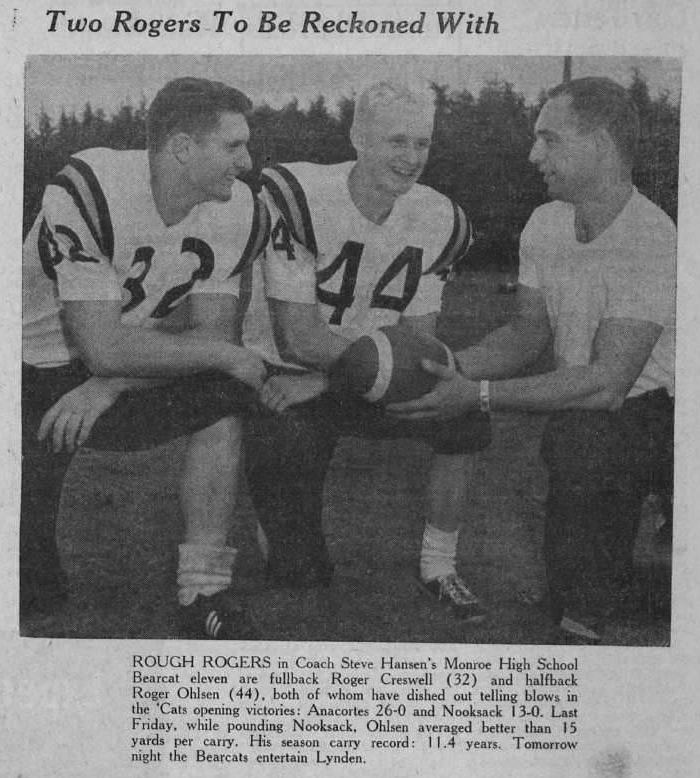 Monroe vs Lake Stevens, 19601962 Monroe Bearcats TeamMonroe at Sultan, 19621963 Monroe Bearcats LettermenRoger Creswell, Roger Ohlsen, and Coach Hansen, 1963Coach Hanson, Jimmy Scharf, Danny Weaver, and Rick Laizure, 1963Monroe vs Concrete, 19641965 Monroe Bearcats TeamMonroe vs Langley, 1965Monroe vs Stanwood, 19651966 Monroe Bearcats TeamMonroe vs Lynden, 1966Monroe vs King’s Garden, 1966Monroe vs Lake Stevens, 1966Monroe vs Concrete, 1966Monroe Offensive Linemen, 1967Randy Olson and Jim Armstrong, 19671969 Monroe Bearcats TeamMonroe vs Mount Baker, 1969Monroe vs Langley, 1969