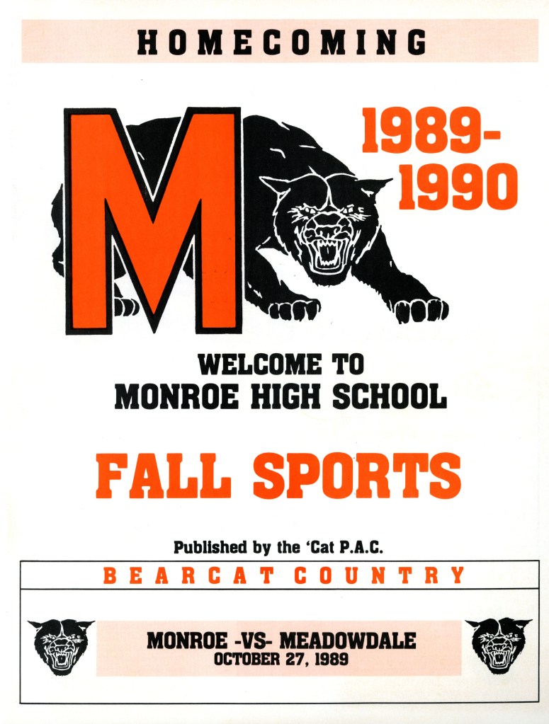 A collection of programs from a variety of games throughout the years. There is a variety in quality and length, as they range from being simple one page flyers to detailed programs. In these programs are pictures of players, coaches, and rosters of both teams. The more lengthy programs will also contain advertisements from different sponsors, making the program a gateway into years gone by. Click on a decade to see the collection of programs from those years. Special thanks to both Kurt Nowadnick for sharing many of the older programs and the Monroe Bearcat Football Boosters for providing programs from the 2010’s.