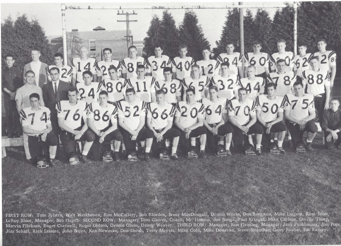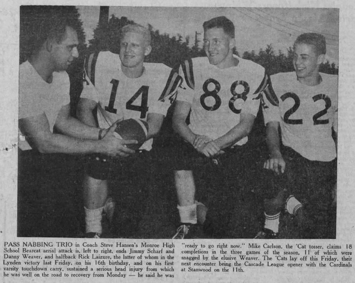 During the 1950’s, the Bearcats experienced a golden age in program history as they were competitive throughout the decade. Capturing two Tri-County championships in 1952 and 1956, Monroe seemed poised for continued greatness until the departure of Coach Cliff Gillies after the 1958 season. As new Head Coach Jerry Ramey took over, the cohesion in the program fell apart as Monroe experienced its first losing season since 1949. Now playing in the top heavy Class-A Cascade League, Bearcat dominance in the conference was quickly fading. With another losing season in 1960, Ramey stepped down and Monroe looked for a new coach to get the team back to its winning ways. The school hired the young Steve Hanson, a former football player at Western Washington University, to revitalize the program ahead of the 1961 season. Confident in his abilities and experienced by his time as a high school quarterback, Hanson quickly energized the program. While Hanson brought excitement back to Monroe, he noticed a group of young sophomore players that would be the foundation for future success. During a preseason game, Quarterback Mike Carlson, Fullback Roger Creswell, Offensive Linemen Marv Flickner, Running Back Roger Ohlsen, and End Dan Weaver all impressed onlookers.[1] With a new coach and a core of young players, Monroe was on the way to greatness.